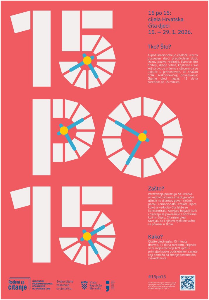 Nacionalni čitalački izazov 15 po 15 posvećen je djeci predškolske dobi i svima koji za njih skrbe, a traje od 15. do 29. siječnja 2026. Izazov i prateću kampanju provodi Ministarstvo kulture i medija u okviru Nacionalnog programa za poticanje čitanja djeci od najranije dobi Rođeni za čitanje.