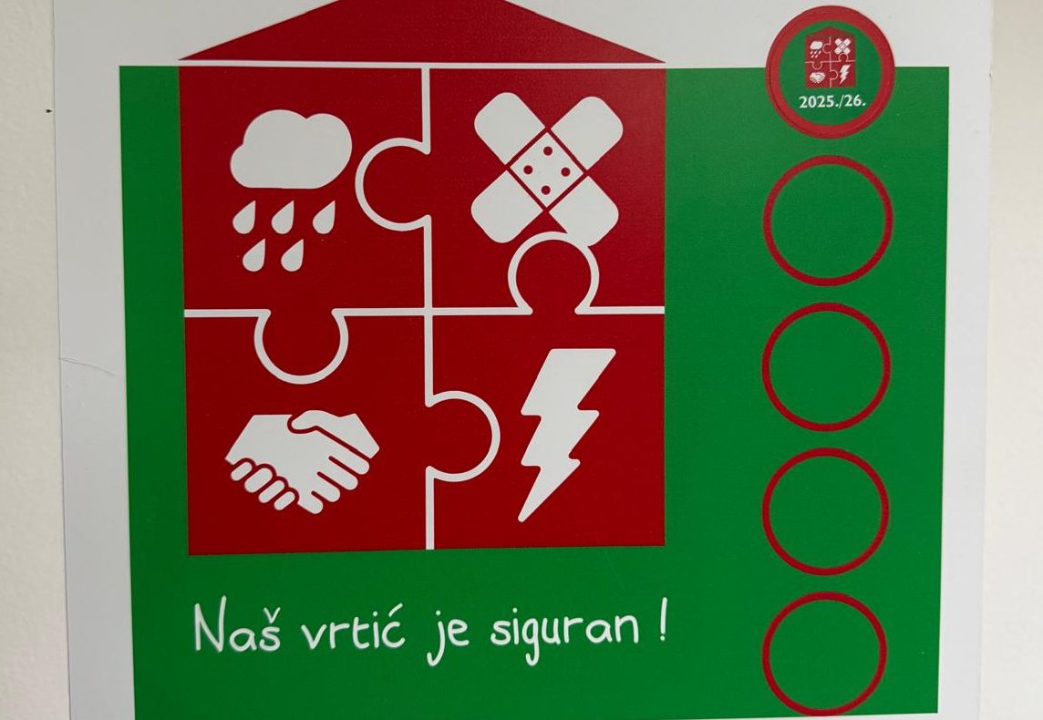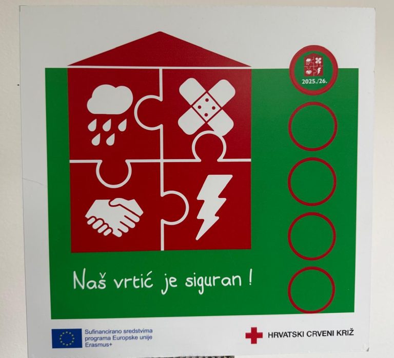 Ova je oznaka potvrda našeg kontinuiranog rada na stvaranju sigurnog, odgovornog i poticajnog okruženja za djecu te ispunjavanja uvjeta i kriterija Hrvatskog Crvenog križa vezanih uz sigurnost i pripremljenost u kriznim situacijama.